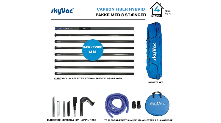 SkyVac Premium 50 mm spændelåsstænger-pakken er den absolut bedste opgradering til enhver tagrenderenser, designet til maksimal sugekraft, stabilitet og præcision. De ultralette carbon hybrid stænger vejer kun 350 g pr. stang og giver enestående kontrol selv i stor højde. Med den patenterede Elite Vac Release sugereguleringsstang og det avancerede Hairpin Neck anti-blokeringsled får du fuld sugekontrol og færre blokeringer – perfekt til dybdegående rensning af selv de mest tilstoppede tagrender. Ideel til professionelle og erhverv, der ønsker hurtigere, sikrere og mere effektiv tagrenderensning op til fire etagers højde.