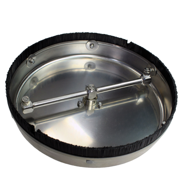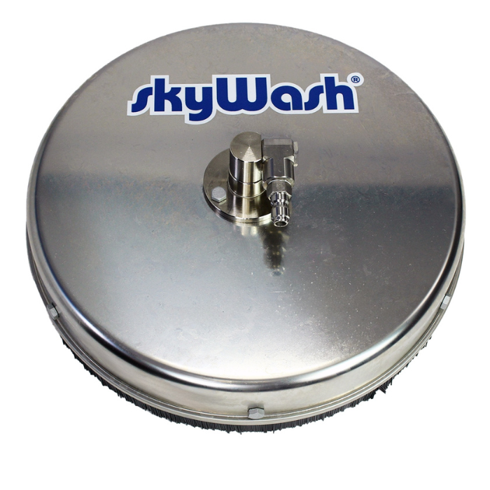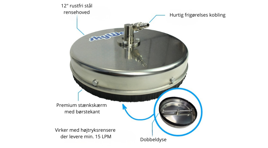 Det 12” rensehoved i rustfrit stål med anti-sprøjt børstekant sikrer hurtig og ensartet tagrens.
