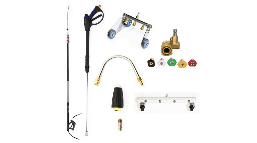 Denne komplette tilbehørspakke til højtryksrensere indeholder alt, hvad du behøver til effektiv rengøring af fliser, terrasser, indkørsler, facader og tagrender.