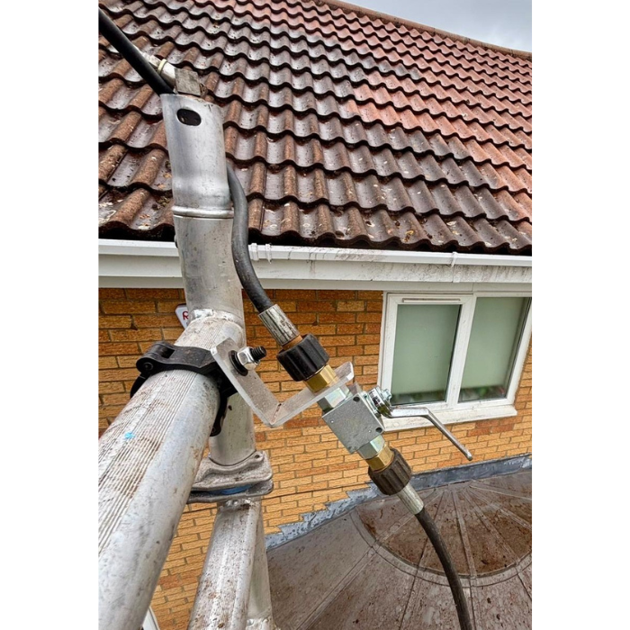 Den indbyggede ventil gør det muligt at tænde og slukke vandtrykket direkte fra stilladset, uden at gå ned til maskinen.